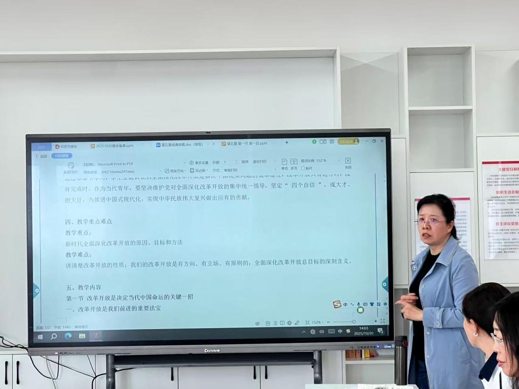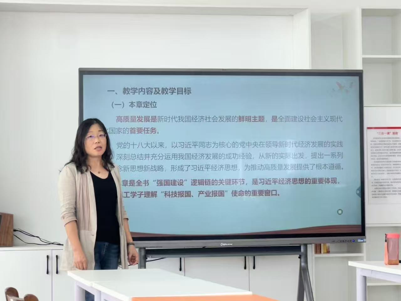 本次备课会围绕教材第五章“全面深化改革开放”、第六章“推动高质量发展”进行教学研讨。许晔副教授以 “改革开放是我们前进的重要法宝” 为主题,从改革开放的历史逻辑、改革开放的理论逻辑、改革开放的现实逻辑三个维度进行了精彩的教学展示,并将党的二十届三中全会精神有机融入主讲内容。杨春玲副教授紧扣第六章“推动高质量发展”进行了内容翔实、逻辑清晰、重难点突出的说课,包括教学目标、教学策略、教学反思三部分。在教学方法层面,杨老师认为采用校史沉浸式案例教学+校友故事案例教学可以引导学生通过学习建立起专业知识和现代化建设的情感联结。