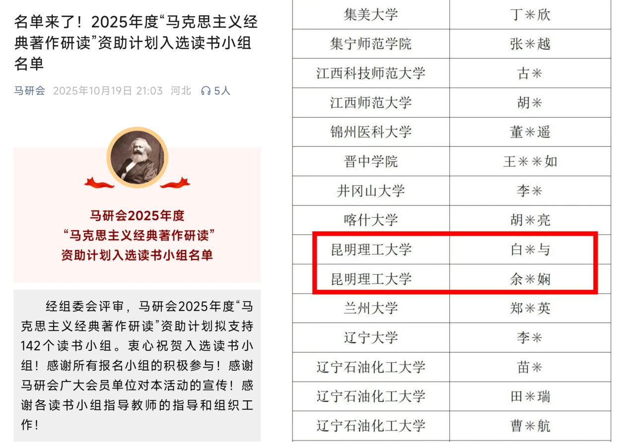 中国高等教育学会马克思主义研究分会于9月发布2025年度资助计划通知,经个人申报、院校指导、组委会评审,最终全国拟资助142个读书小组。同批入选的高校包括清华大学、北京大学、中国人民大学、中国社会科学院大学、吉林大学等116所高校。