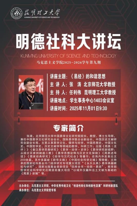 11月1日(周六)9:30-11.30,北京师范大学中国易学文化研究院院长张涛教授受邀为我院师生进行学术前沿讲座,讲座主题为“《易经》的和谐思想”。此次讲座为2025-2026学年明德社科大讲坛系列讲座之一,由马克思主义学院、中华优秀传统文化“创造性转化和创新性发展”科研创新团队联合举办,任利伟老师主持,学院师生共40余人参加。
