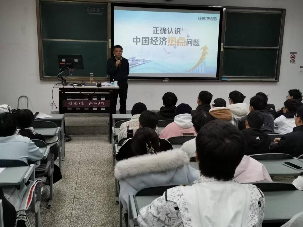11月19日下午,校纪委书记张绍宗在中心区教学楼104教室,以《正确认识中国经济热点问题》为主题,为车辆、交通工程、信计、应化等专业的2025级本科生讲授思政课。