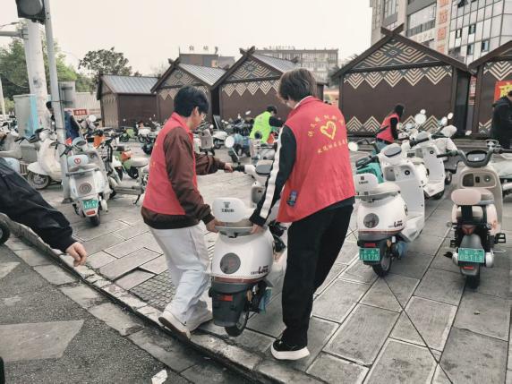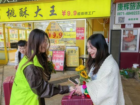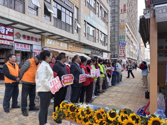 启动仪式结束后,丰富多彩的志愿服务活动全面展开。部分师生拿起扫帚、钳子、垃圾袋,迅速投入到社区商圈及主干道的环境整治行动中。他们仔细清理路面垃圾、烟头,认真擦拭公共设施,规范摆放共享单车,并对盲道上的障碍物进行细致清理。同学们分工协作、干劲十足,在劳动中体悟“劳动最光荣、奉献最美丽”的雷锋精神内涵。与此同时,“理育菁华”读书小组同学们活跃在“打卡志愿服务点送鲜花活动”的各个点位。她们热情地向居民和游客送上代表着感谢与敬意的向日葵。一束束鲜花,一句句问候,让雷锋精神在互动体验中温暖传递。